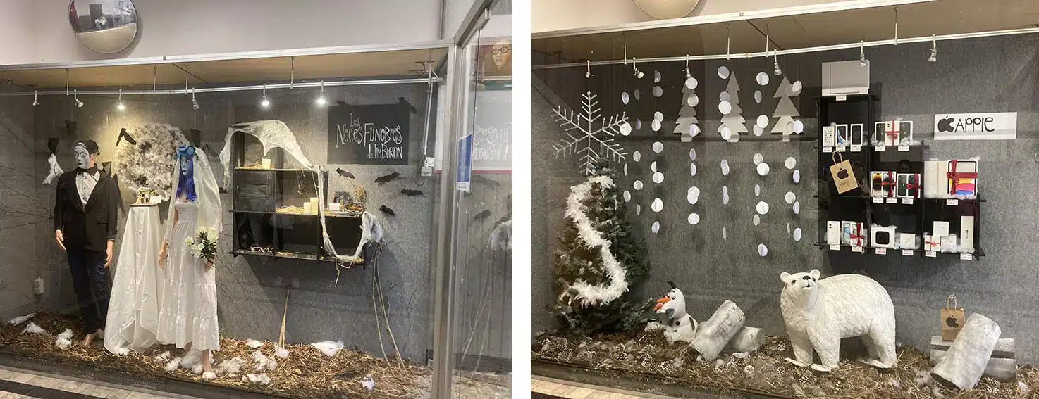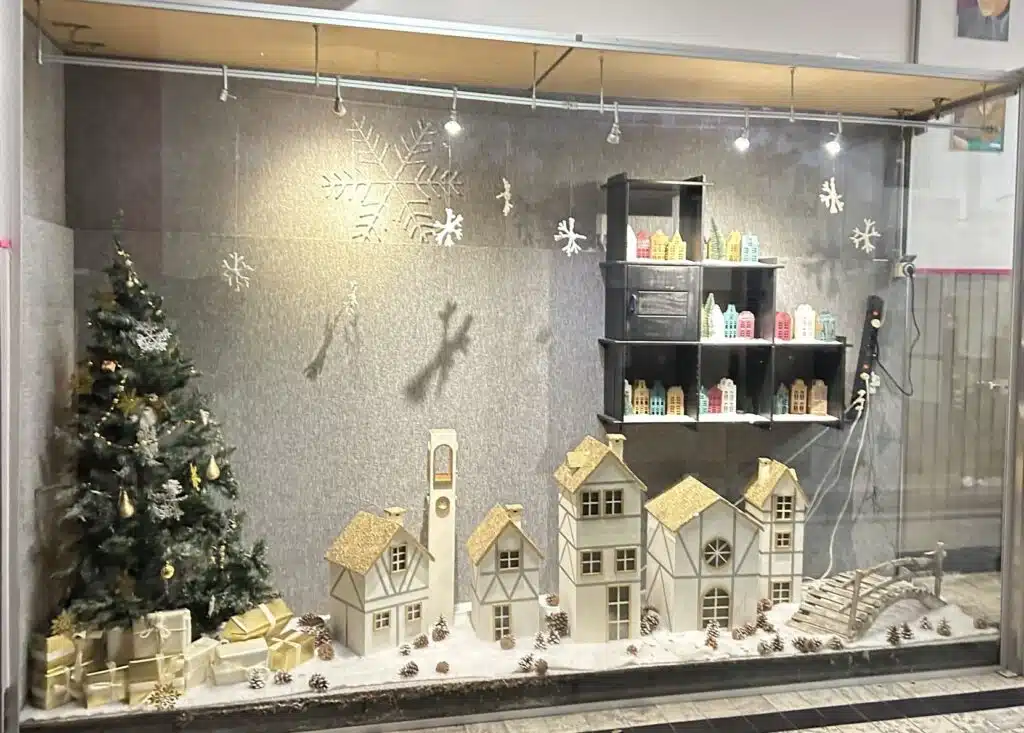 Ils ont imaginé un village de Noël lumineux, soigneusement mis en scène, sans oublier les incontournables de cette période festive : le sapin de Noël et les cadeaux. Le résultat est une vitrine élégante et accueillante, qui attire le regard et invite à la rêverie.